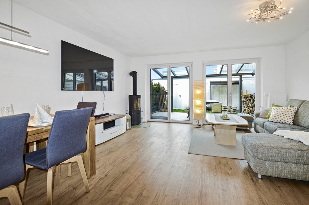 Das moderne Interieur des Hauses lässt keine Wünsche offen. Im Erdgeschoss finden Sie auf der linken Seite die moderne und hochwertige Schreinerküche mit allen wichtigen Elektrogeräten. Direkt nebenan gelangen Sie in das lichtdurchflutete Wohnzimmer mit einem Schwedenofen und bodentiefen Fenstern und einer Terrassentür, die Sie direkt auf die Terrasse und den eigenen pflegeleichten Garten führt. Hier können Sie die Sonne in vollen Zügen genießen.