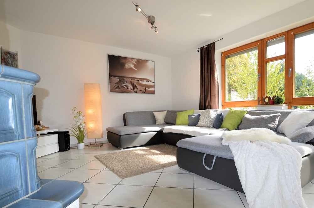 Wohn-und Essbereich: helle Fliesen, Kachelofen, Fußbodenheizung